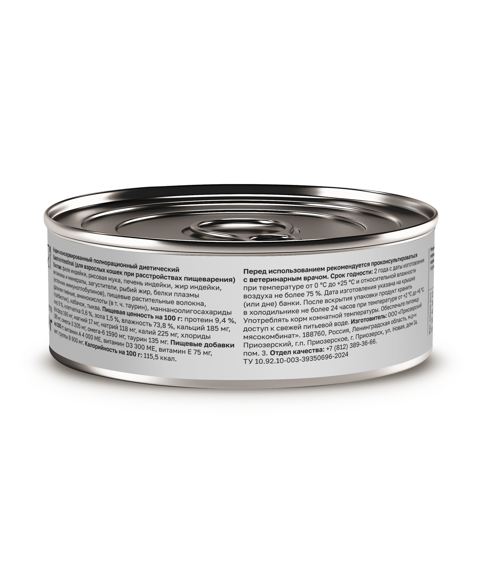 филе индейки, рисовая мука, печень индейки, жир индейки, витамины и минералы, загустители, рыбий жир, белки плазмы (источник иммуноглобулинов), пищевые растительные волокна, дрожжи пивные, аминокислоты (в т.ч. таурин), маннаноолигосахариды (пребиотик), кабачок, тыква.