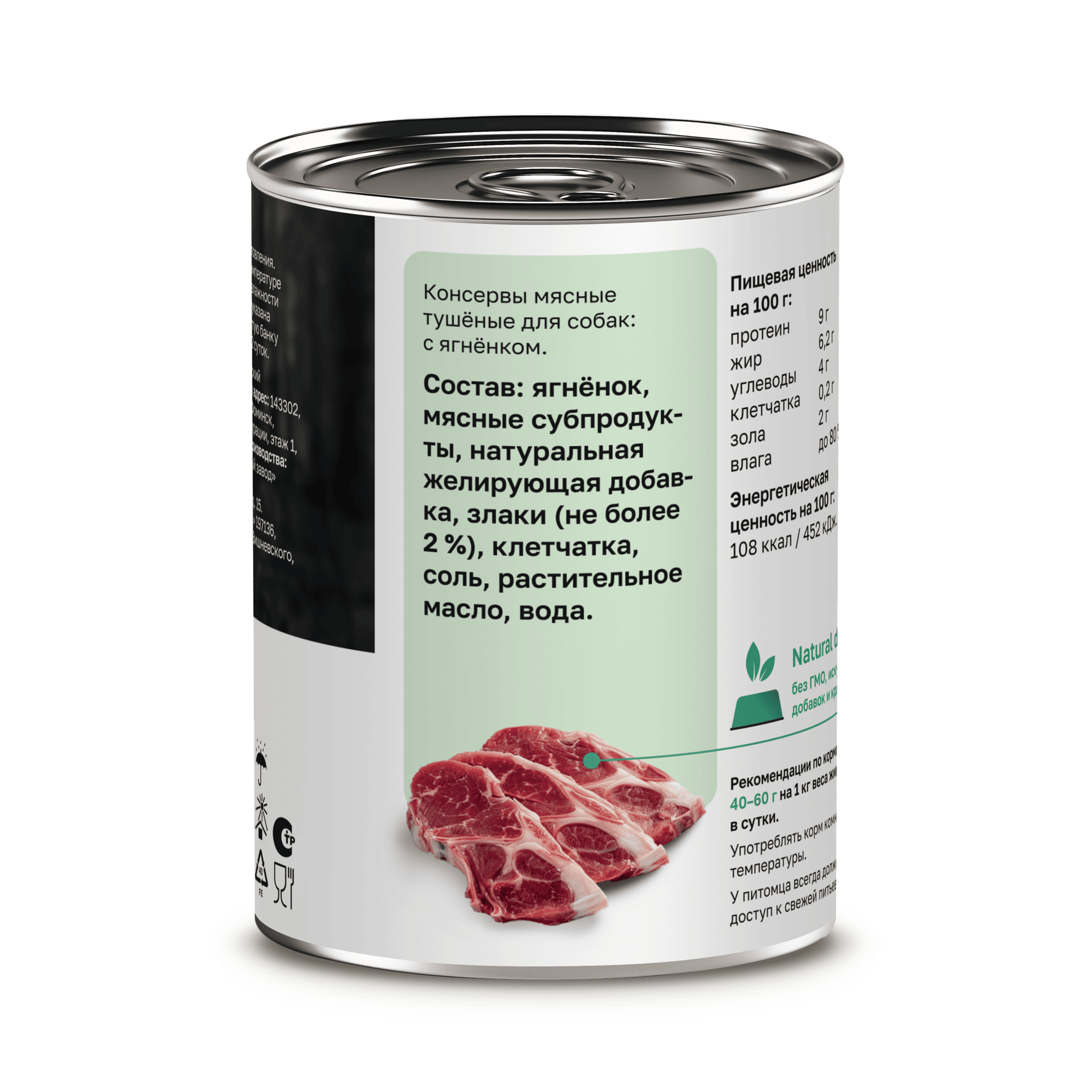 Ягнёнок, мясные субпродукты, натуральная желирующая добавка, злаки (не более 2%), клетчатка, соль, растительное масло, вода.