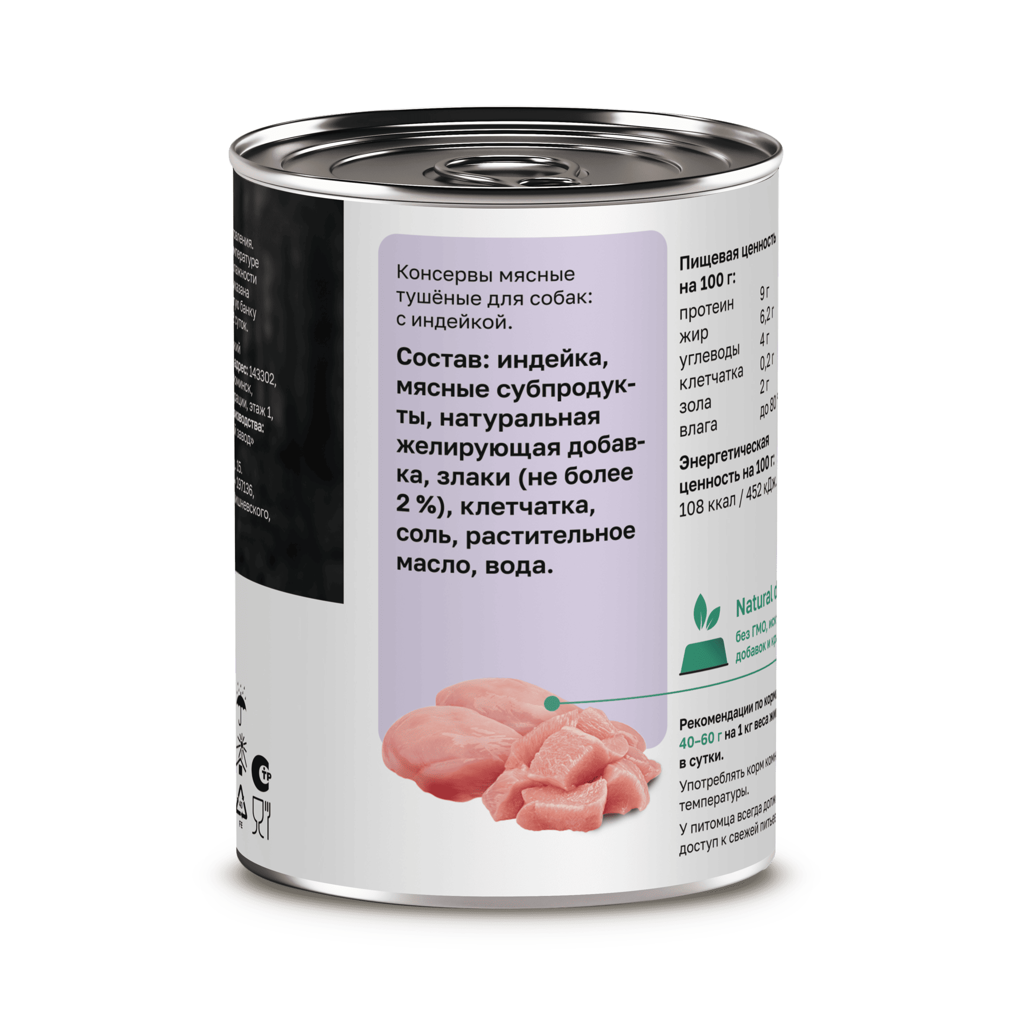 Индейка, мясные субпродукты, натуральная желирующая добавка, злаки (не более 2%), клетчатка, соль, растительное масло, вода.