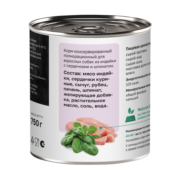 мясо индейки, сердечки куриные, сычуг, рубец, печень, шпинат, желирующая добавка, растительное масло, соль, вода.
