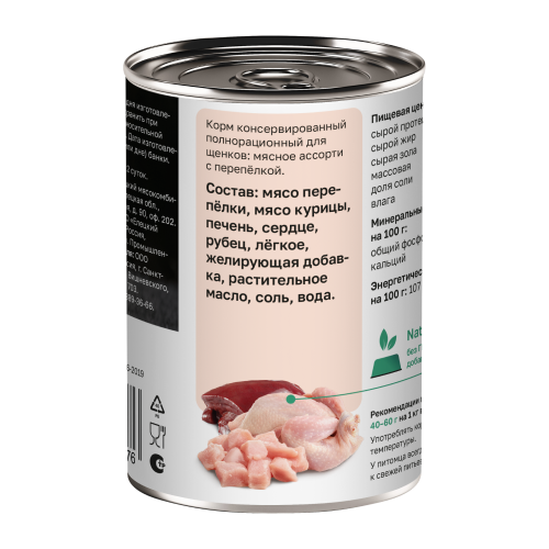 Мясо перепёлки, мясо курицы, печень, сердце, рубец, лёгкое, желирующая добавка, растительное масло, соль, вода.