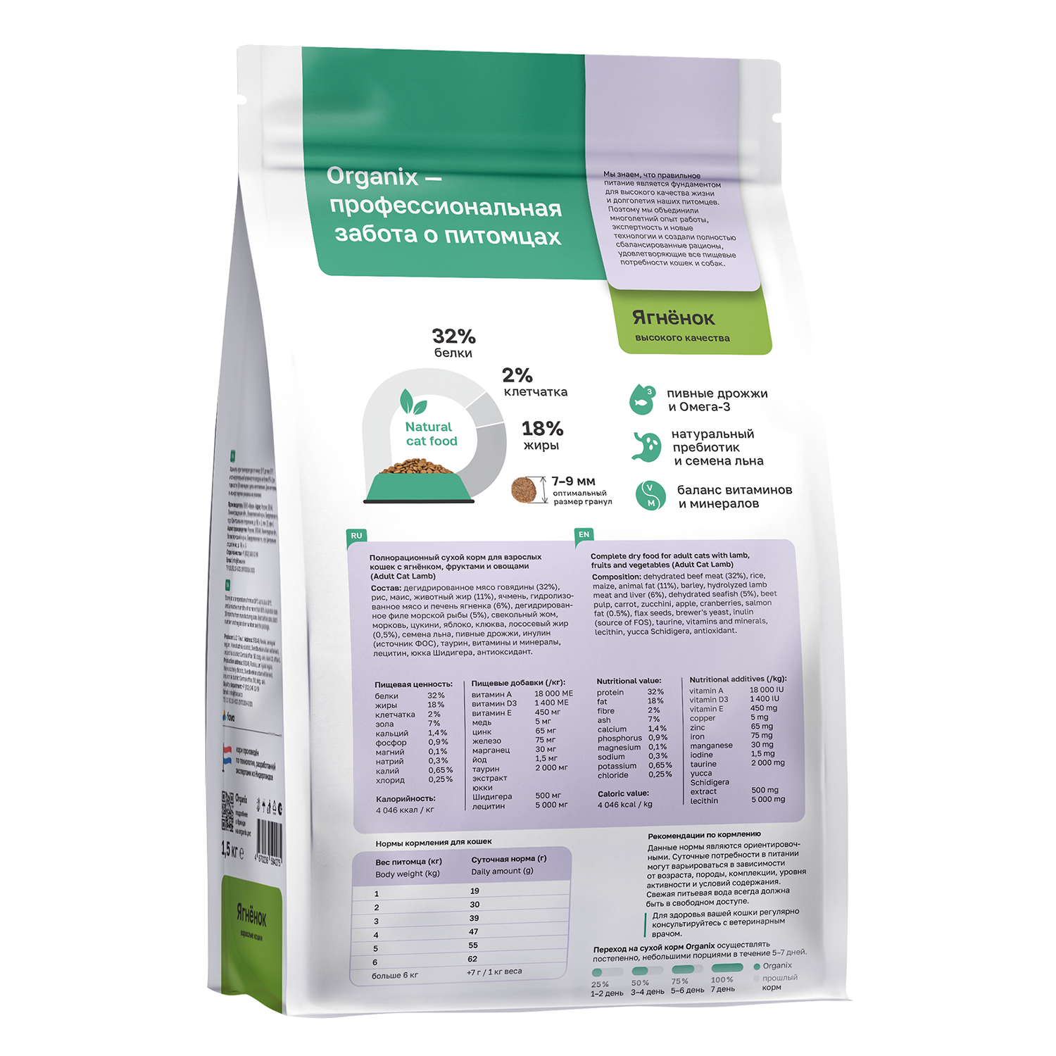 дегидрированное мясо ягненка (14%), маис, дегидрированная курица, рис, куриный жир, дегидрированная рыба, яичный порошок, пивные дрожжи, дегидрированный лосось, семена льна, свекольный жом, лососевый жир, инулин (источник ФОС).